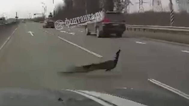 «******* страус!» — сказал мужчина, перед тем как проехать мимо. «Откуда он здесь?» — изумленно спросила его спутница. Несмотря на проносящиеся мимо автомобили, павлин переходил дорогу очень неторопливо. Откуда он взялся на трассе, остается неизвестным.
