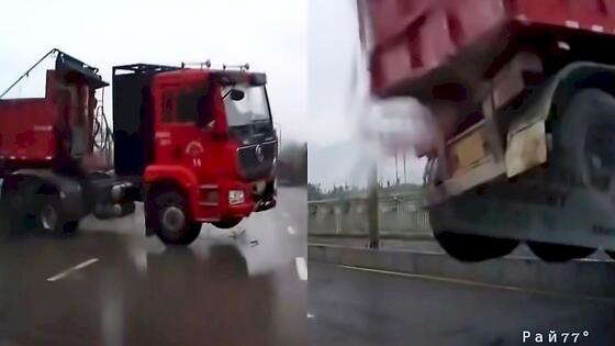 Видеорегистратор, установленный в салоне транспортного средства автора видео, запечатлел неожиданное появление грузовика, который проложил маршрут поперёк трассы, снёс ограждение и упал с моста.