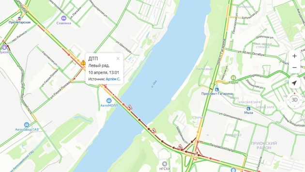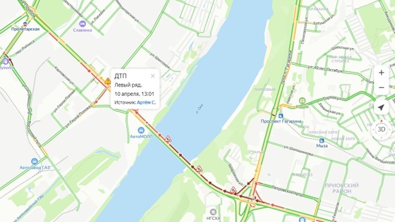 Авария произошла на Мызинском мосту в Нижнем Новгороде днем 10 апреля. Об этом сообщает сервис «Яндекс. Карты».