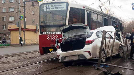 Уточняется, что водитель такси, управлявший Kia Rio, отвлекся на телефон и не заметил стоящий трамвай. В результате столкновения автомобиль снес забор и дорожный знак.