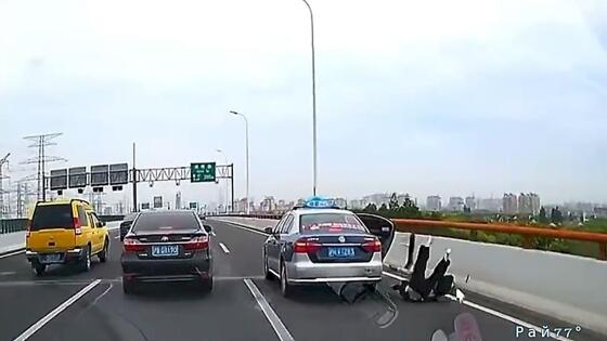 Результат спора между работницей таксомоторного парка, не пожелавшей останавливаться на скоростной эстакаде, в шанхайском районе Пудун и пассажиркой, запечатлел случайный участник дорожного движения.