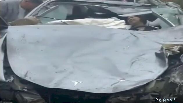 Очевидцы трагедии запечатлели драматичные последствия происшествия и его виновницу вместе с пассажиром, зажатых в искорёженном транспортном средстве.