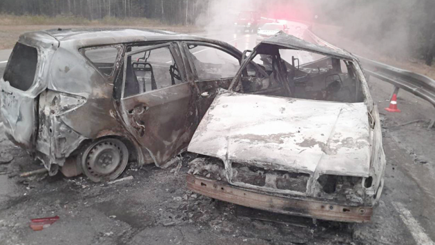 Столкновение иномарок произошло накануне на 57 километре федеральной трассы "Байкал". По данным Госавтоинспекции, легковой автомобиль Volvo, двигавшийся в направлении райцентра, выехал на встречную полосу и врезался в дорожное ограждение, после чего столкнулся с японским седаном. В результате пробоины в бензобаке оба авто загорелись.