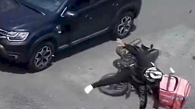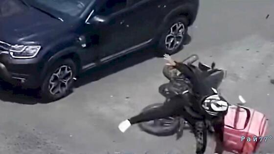 Доставщик пищи, управляя своим мотоциклом, оказался на пути у легковушки, после столкновения с которой совершил порядка трёх оборотов вокруг своей оси.
