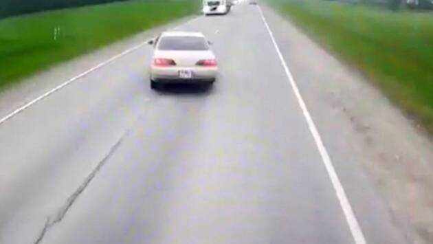 На кадрах видно, как автомобиль пытается совершить обгон и теряет управление. Ему навстречу едет фура, которая не успевает затормозить, из-за чего она на большой скорости сталкивается лоб в лоб с легковушкой и сносит ее с дороги. Впоследствии легковое авто сталкивается с попутно следовавшим Volvo.