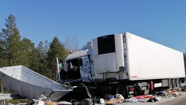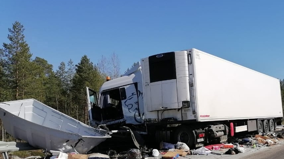 В Кемском районе Карелии водитель автомобиля Toyota с прицепом допустил выезд на встречную полосу, где столкнулся с большегрузом SITRAK.