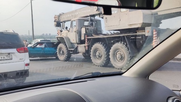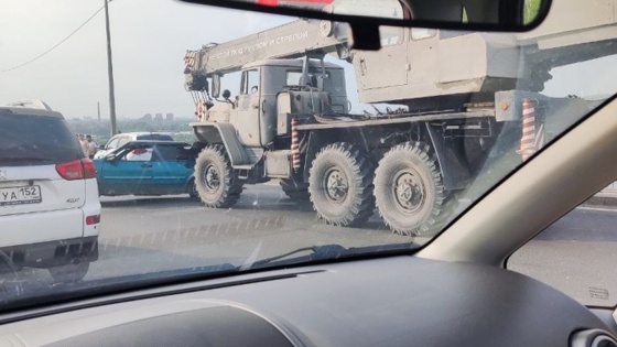 ДТП с участием автокрана и легковушки случилось на Мызинском мосту 30 мая. Об этом сообщает корреспондент ИА «В городе N».