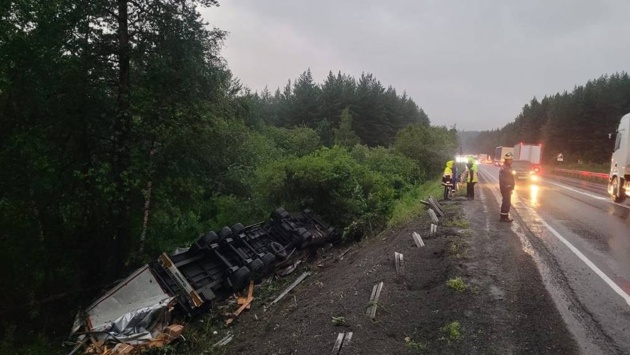 "Неустановленный водитель, управляя автомобилем КамАЗ с полуприцепом Krone, по предварительным данным, в условиях дождя при неустановленных обстоятельствах выехал за пределы проезжей части влево, где совершил наезд на препятствие (металлическое барьерное ограждение), повредив его, с последующем опрокидыванием в кювет", – рассказали в пресс-службе УГИБДД по Челябинской области.