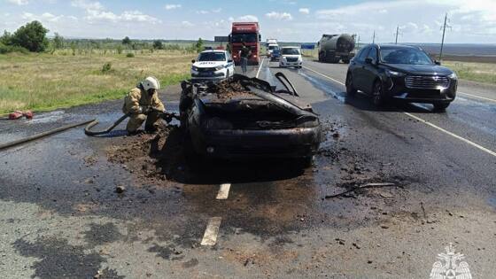 Накануне на трассе М-5 в районе Сорочинска «Лада Калина» столкнулась с грузовиком «Даф». Последствия ликвидировали спасатели ГУ МЧС.