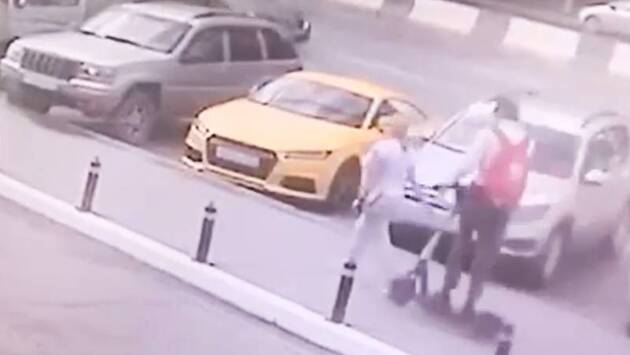 Россиянин на электросамокате со спины снес женщину, перелетел через нее и попал на видео