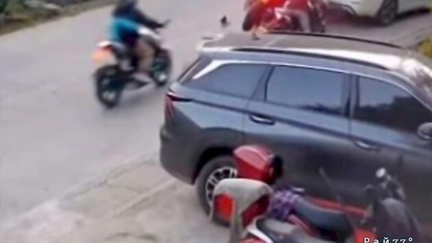 Наезд сразу четверых мотоциклистов на легковушку попал на видео в Китае