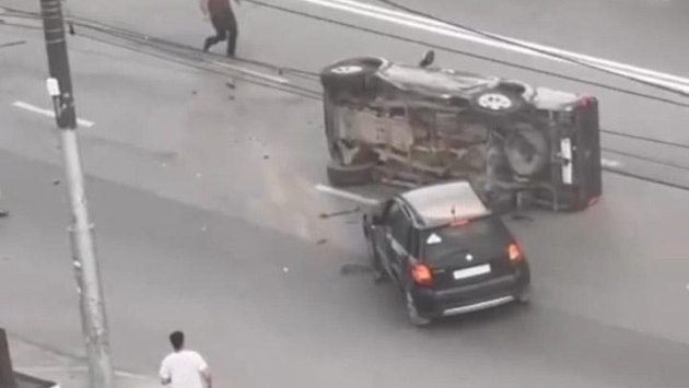 Три автомобиля столкнулись в Новосибирске: столкновение перевернуло пикап