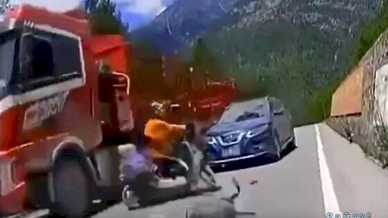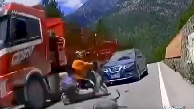 Житель китайского населённого пункта, прокладывая путь на мотоцикле по скалистой местности, выбрал неудачное время для обгона и угодил в незавидную ситуацию.