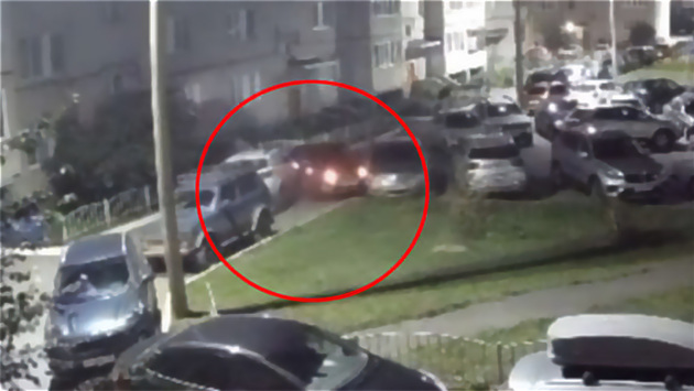 На видео с камеры наблюдения видно, что белая Creta, двигаясь по кругу, задела несколько машин. После того, как одну из них развернуло поперек дороги, водитель Creta выехала на газон.