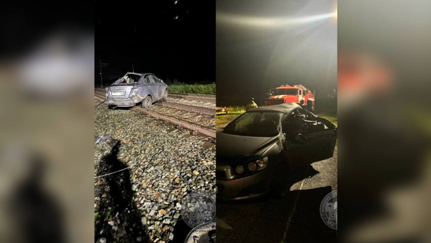 На фотографии с места ДТП видно, что транспортное средство с различными повреждениям стоит на рельсах. Также заметно, что удар пришелся в левую сторону автомобиля. Неизвестно по каким причинам произошла авария.