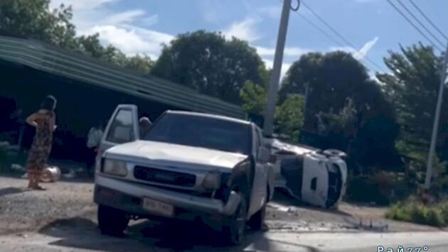 70-летняя женщина наклонилась, чтобы убрать траву во дворе своего жилища, когда два пикапа врезались друг в друга на перекрёстке оживлённой магистрали перед её домом в провинции Чаченгсао.