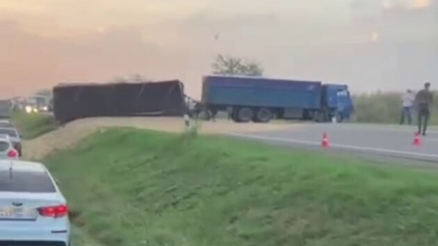 В результат обе полосы дороги оказались перекрыты стоящим поперек дороги большегрузом. Судя по кадрам с места, один из прицепов «прилег» на бок, а проезжая часть скрылась под зерном. Другие автомобилисты объезжают аварию по обочине.