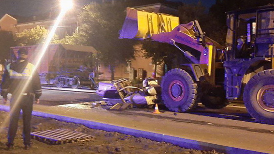 Спасатели МАСС опубликовали кадры с места дорожно-транспортного происшествия на улице Мира. Ночью 14 сентября автомобиль Nissan Sunny на высокой скорости врезался в ковш фронтального погрузчика.