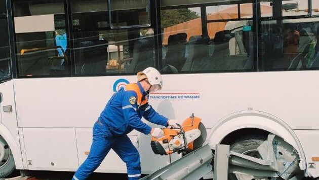 Установлено, что водитель автомобиля КамАЗ не справился с управлением и допустил столкновение с автобусом. Тот отлетел и пробил разделительное ограждение. Сотрудники управления транспорта и ДПС оказывали содействие в расчистке проезжей части федеральной автодороги. Спасатели при помощи бензореза спилили леерное ограждение. Авто – участков ДТП убрали на обочину.