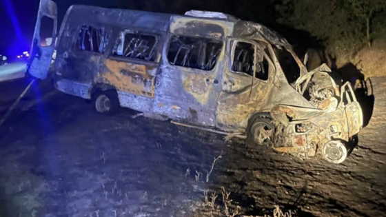 На опубликованных очевидцами кадрах видно, что микроавтобус после ДТП полностью сгорел. Также, судя по видео, на месте происшествия продолжают работу правоохранительные органы.