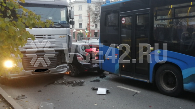 В Госавтоинспекции сообщили подробности происшествия на кемеровском проспекте, в котором приняли участие автобус, фура и два легковых автомобиля.
