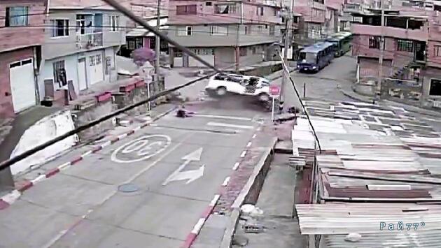 Шокирующие кадры видеонаблюдения показывают, как тяжёлое транспортное средство мчалось вниз по склону и оторвалось от земли.