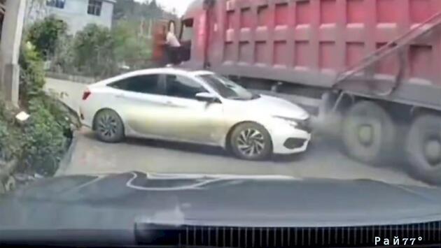 Момент крушения большегруза попал в объектив видеорегистратора, установленного в салоне автомобиля, принадлежащего случайному участнику дорожного движения в Китае.