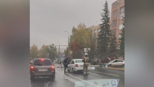 Упавшая опора перегородила обе полосы по направлению в центр. Заложником ситуации оказался автомобиль, который ехал вниз - над ним провисли провода. На месте работают спасатели и сотрудники Госавтоинспекции.