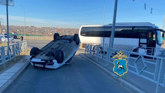 После столкновения автобуса с машиной легковушка перевернулась на крышу. Причины и виновник аварии на данный момент устанавливаются.