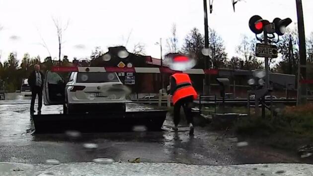 Ситуация развернулась в Октябрьском городке. Водитель Volkswagen решил проскочить переезд после красного сигнала и оказался в ловушке: опустился шлагбаум, поднялись заградительные колодки.