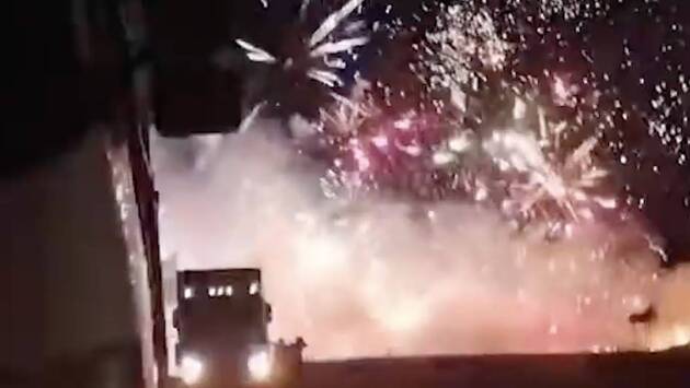 На кадрах видно ночную дорогу, на которой беспрерывно взрываются фейерверки. Все происходило возле заправки. При этом пожарным удалось ликвидировать возгорание до того, как огонь перекинулся на АЗС.