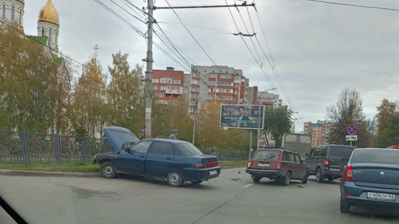 Происшествие случилось на перекрестке в Дашково-Песочне, неподалеку от храма. Одна из машин в результате влетела в столб. На асфальте видны отлетевшие от удара пластиковые детали.