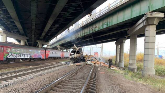В Петербурге тягач упал на железнодорожные пути после столкновения с ограждением