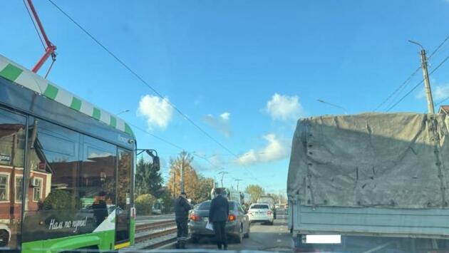 В Курске 2 иномарки столкнулись и одна вылетела на трамвайные пути