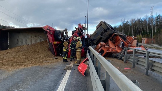 На кадрах можно заметить, что самосвал перевозил песок, который рассыпался на дорогу после того, как машина перевернулась. Автокран же перекинуло за ограждение.
