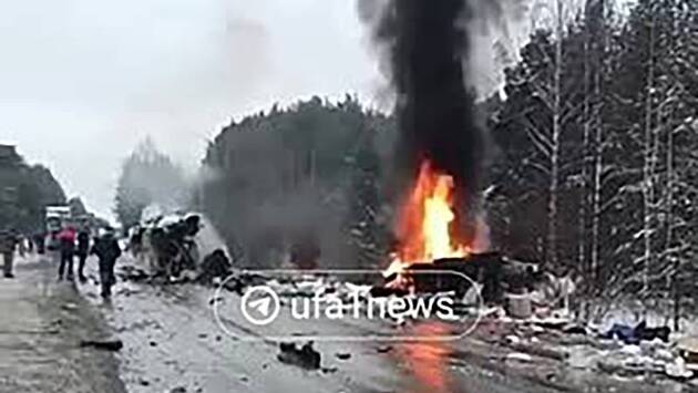 Очевидцы сняли на видео пожар на месте столкновения трех фур в российском регионе