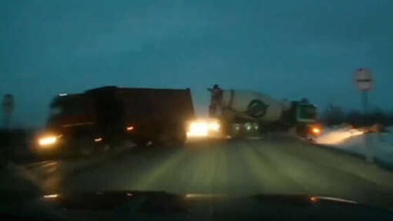 На сибирской дороге попало на видео ДТП самосвала и бетономешалки