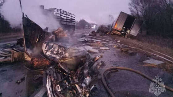 В Нижегородской области две фуры столкнулись и сгорели на федеральной трассе М-7, сообщается в Telegram-канале областного управления МЧС. "В четыре часа дня поступило сообщение о дорожно-транспортном происшествии на трассе М-7 "Волга" у н.п. Лужки Лысковского муниципального округа. После столкновения двух грузовых автомобилей произошел пожар", - отмечается в сообщении. Двум людям, находившимся в автомобилях, выжить не удалось. В районе аварии образовалась 10-километровая пробка, уточняет nn.ru. Разбитые автомобили заблокировали часть трассы. На опубликованных фото видно, что у одного из большегрузов выгорел полуприцеп. Вторая фура, оказавшаяся за пределами проезжей части, также повреждена огнем. Груз из нее рассыпался на дороге.
