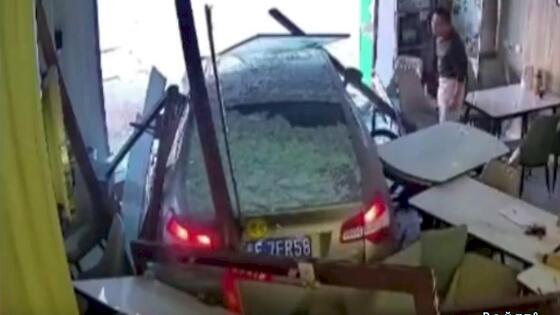 Житель китайского мегаполиса, находясь за рулём своего автомобиля, умудрился разнести закусочную.