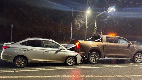 Столкнулись седан и пикап. О пострадавших не сообщается. На фото видно, что автомобили получили повреждения.