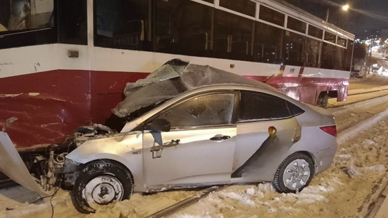 У трамвая в Новосибирске отказали тормоза, он снес такси