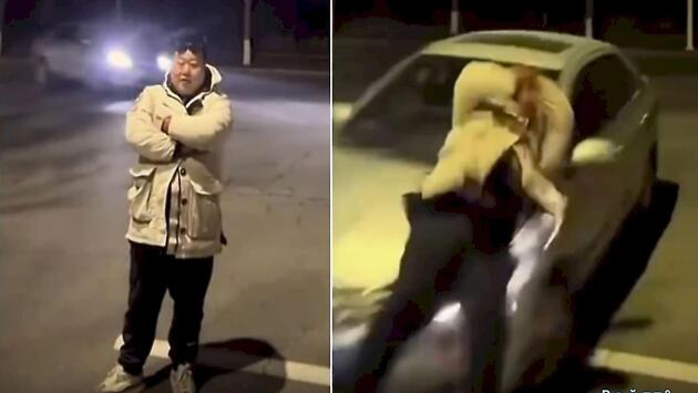 Китайский любитель острых ощущений доверился своему другу, управлявшему легковушкой во время записи рискованного трюка.