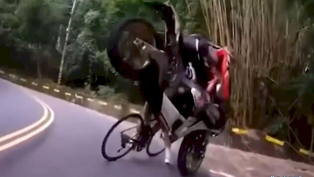 Приятель мотоэкстремала, совершавший несколько недель назад совместное путешествие, проезжая мимо китайского уезда Цзишань, запечатлел экстренную остановку, случившуюся по вине беспечной велосипедистки.