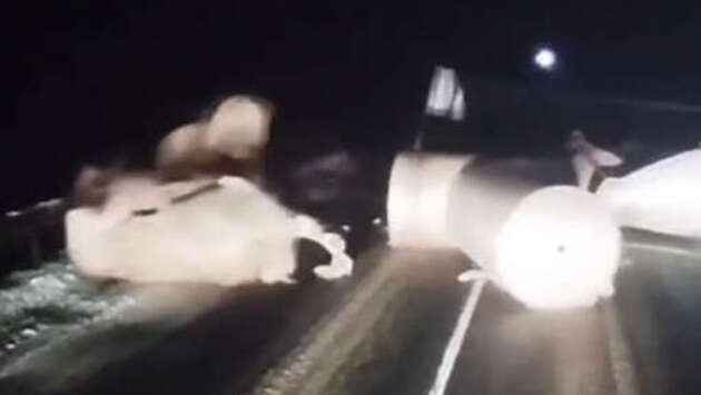 В Вологодской области большегрузная фура опрокинулась и заблокировала движение по федеральной трассе А-123. Об этом сообщается в Telegram-канале областного управления МВД. Авария произошла в Великоустюгском округе, недалеко от деревни Красавино в среду около 17:20. Водитель грузовика Mercedes-Benz с прицепом выехал на встречную полосу и опрокинулся. Массивные рулоны бумаги, которые вез грузовик, в результате аварии выкатились на дорогу. Водитель госпитализирован с травмами. На кадрах видно, что фура заблокировала всю проезжую часть двухполосной дороги. Массивные рулоны покатились в сторону другого грузовика с видеорегистратором, водитель которого успел остановиться. До этого на видео попали последние секунды перед лобовым ДТП с тремя автомобилями на Урале.