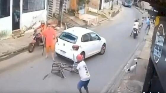 Местный велосипедист, эсцентрично объехав препятствие, оказался на пути у легковушки, водитель которой не преминул наказать наглеца и нанёс удар мачете по багажнику двухколёсного средства передвижения. После чего пострадавшая сторона при помощи такого же предмета самообороны, споткнулась и разбила заднее стекло легковушки, а затем практически сразу была отогнана от транспортного средства своим же велосипедом.