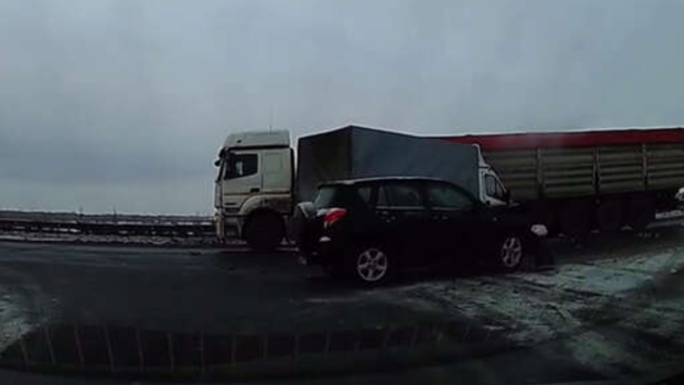 Видеорегистратор машины, водитель которой стал очевидцем аварии, запечатлел момент столкновения. На кадрах видно, как автомобиль Toyota RAV4 выезжает на главную дорогу, не пропускает «Газель» и врезается в нее. От столкновения грузовик отбрасывает во встречный «КамАЗ».