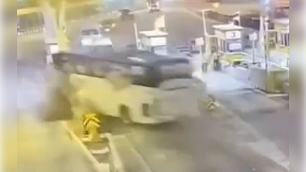 Водитель туристического автобуса потерял управление и въехал в ограждение перед пунктом оплаты на въезде на платный участок дороги. Затем врезался в автомобиль марки Toyota Fortuner.