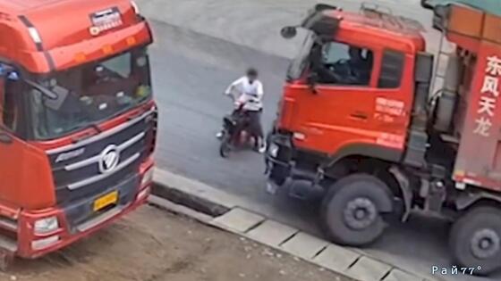 Неосмотрительность 16-летнего участника дорожного движения, выехавшего на скутере перед фурой на оживлённую магистраль в городе Биньчжоу (провинция Шаньдун, КНР).