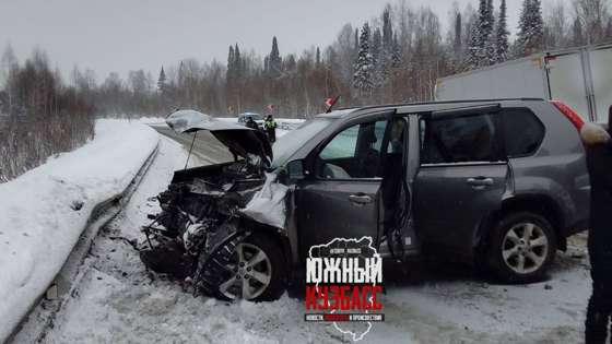На юге Кузбасса не поделили заснеженную трассу внедорожник и автофургон, что обернулось разрушениями.