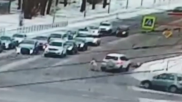 На место оперативно прибыл экипаж скорой помощи, пострадавшие госпитализированы. На кадрах видеозаписи видно, что женщина, которую задел автомобиль, встает после столкновения.
